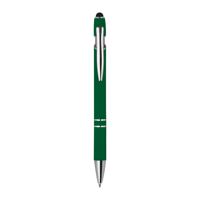 Plastic balll pen with silver applications, blue-writing refill, touch function and patterned grip zone. Your logo will be engraved to the right of the clip.