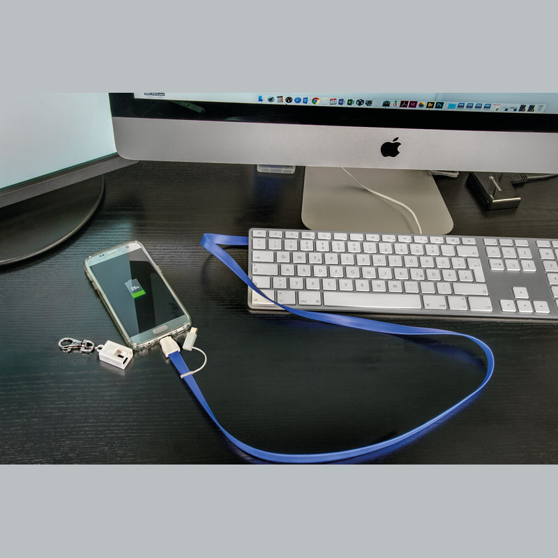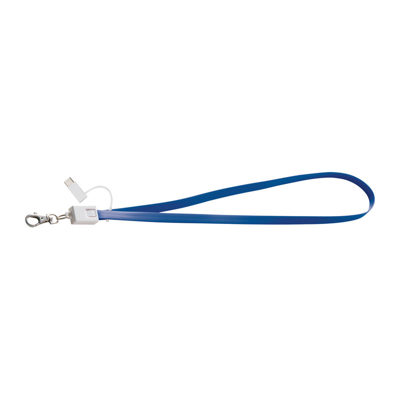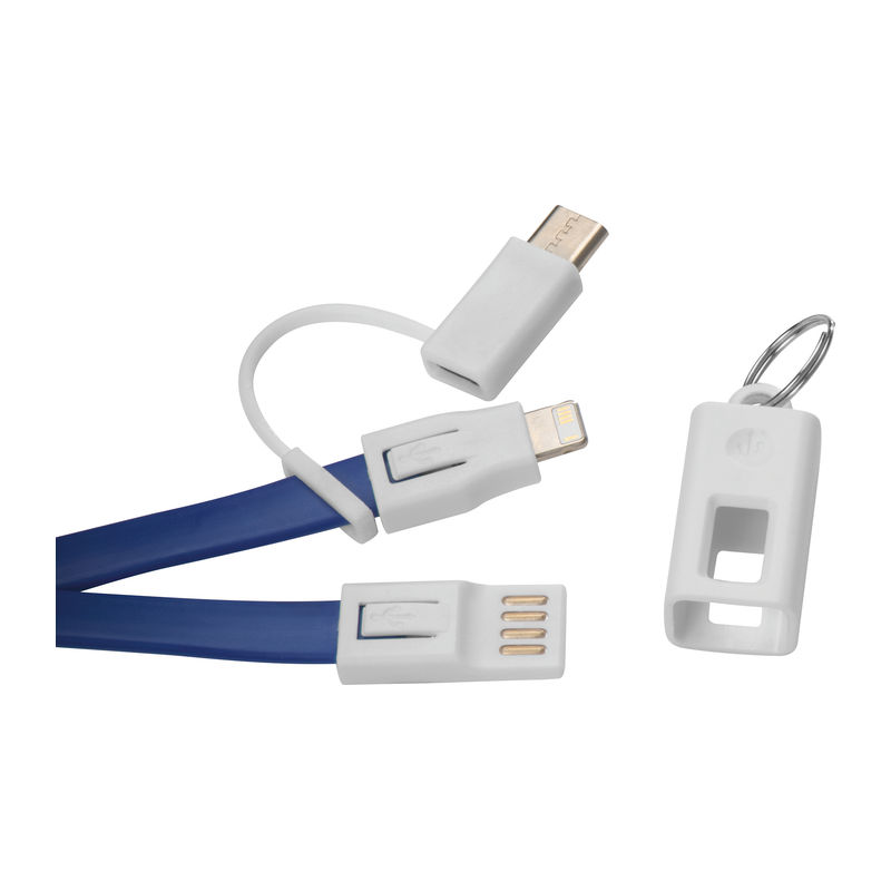 Charging cable in silicone with USB, 2in1 micro USB for Android and iOS, and a Thunderbolt 3 adapter. Your advertisement is printed on the strap.