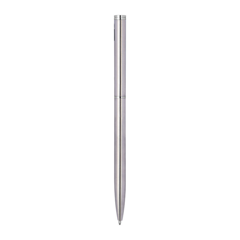 Elegant metal ball pen in a slim shape with chromed clip and blue-writing refill. We will engrave your logo to the right of the clip.