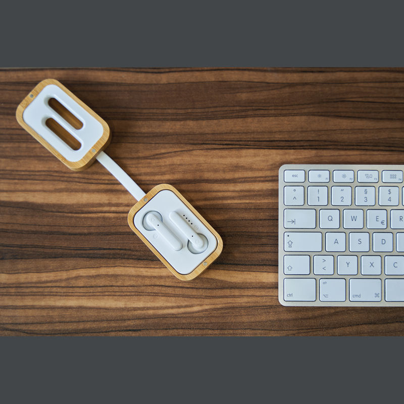 Ergonomic in-ear Bluetooth 5.0 earphones with charging indicator in a USB charging station that serves as a storage location. Bluetooth range up to 10 meters, charging time approx. 1 hour, running time 2-3 hours and 300 mAh battery. Your logo will be engraved on the box.