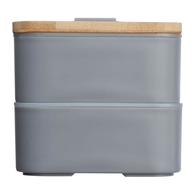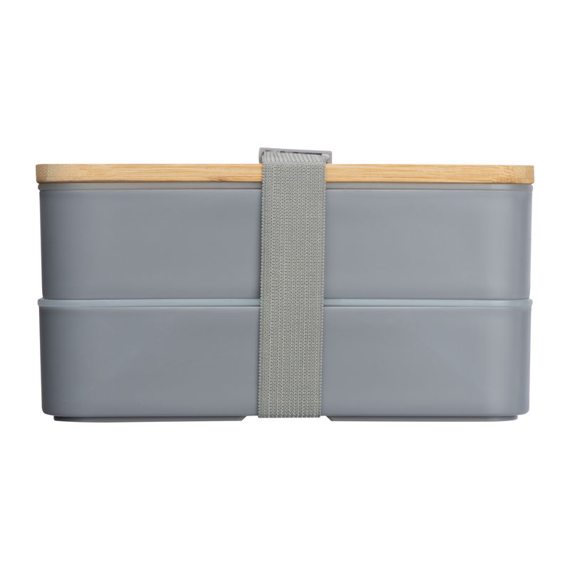 Two-tier lunch box with two separate compartments (both with their own lid), bamboo lid, a separator, knife, fork and a rubber band to close. Your logo will be engraved onto the bamboo lid.