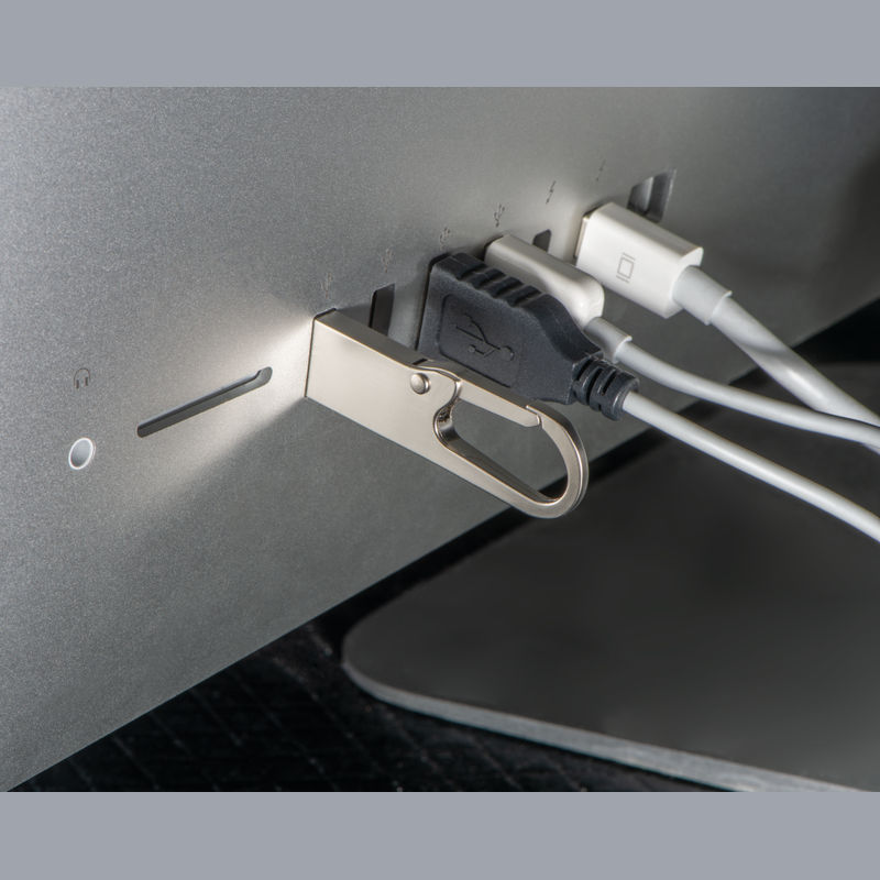 Metal USB stick with 8GB capacity and snap hook. We will engrave your logo on the metal surface.