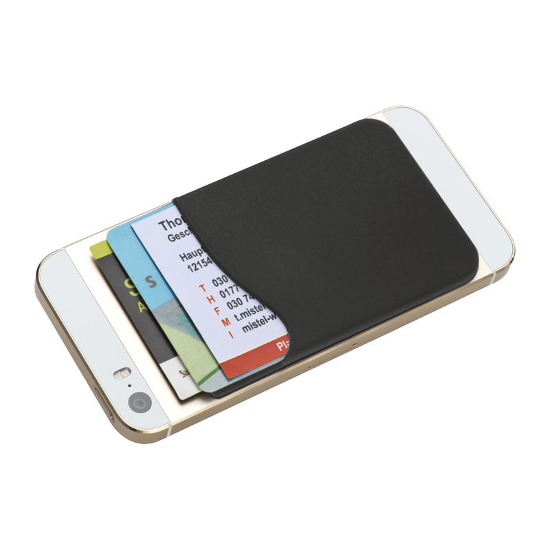 Silicone holder for attaching to the back of your smartphone. There’s enough space for business cards, credit cards, money, and more. We will print your logo (only 1-C in black or white) directly on the bag.