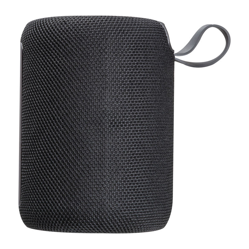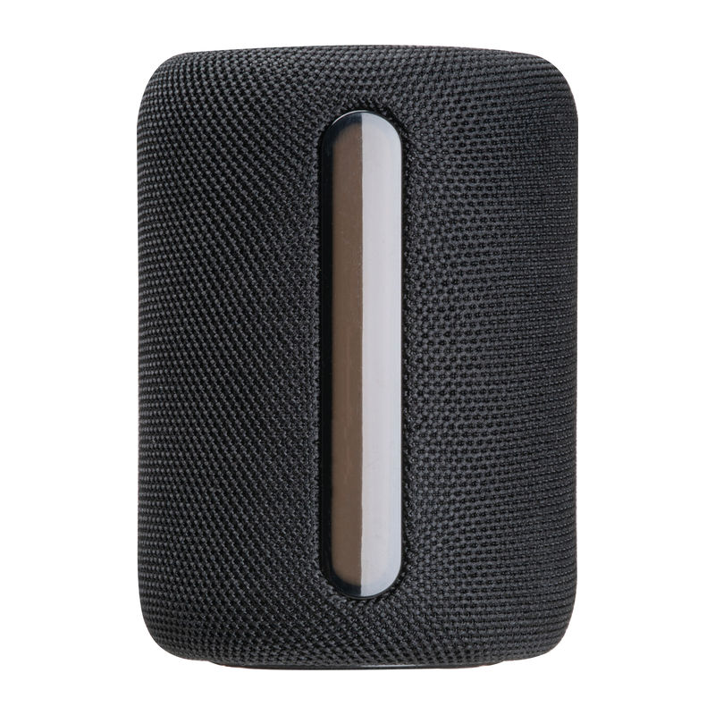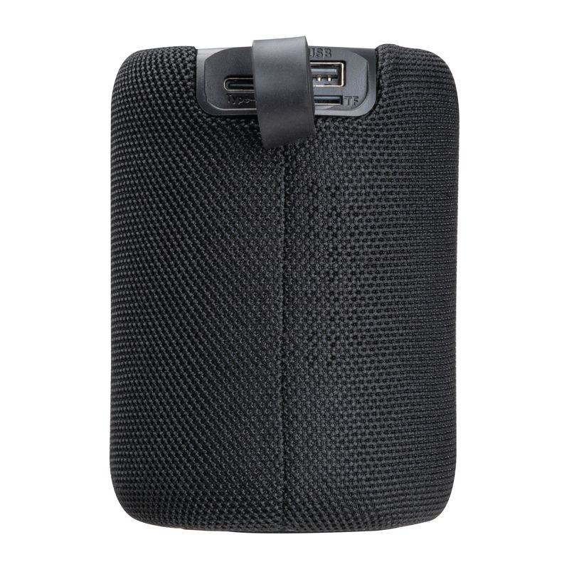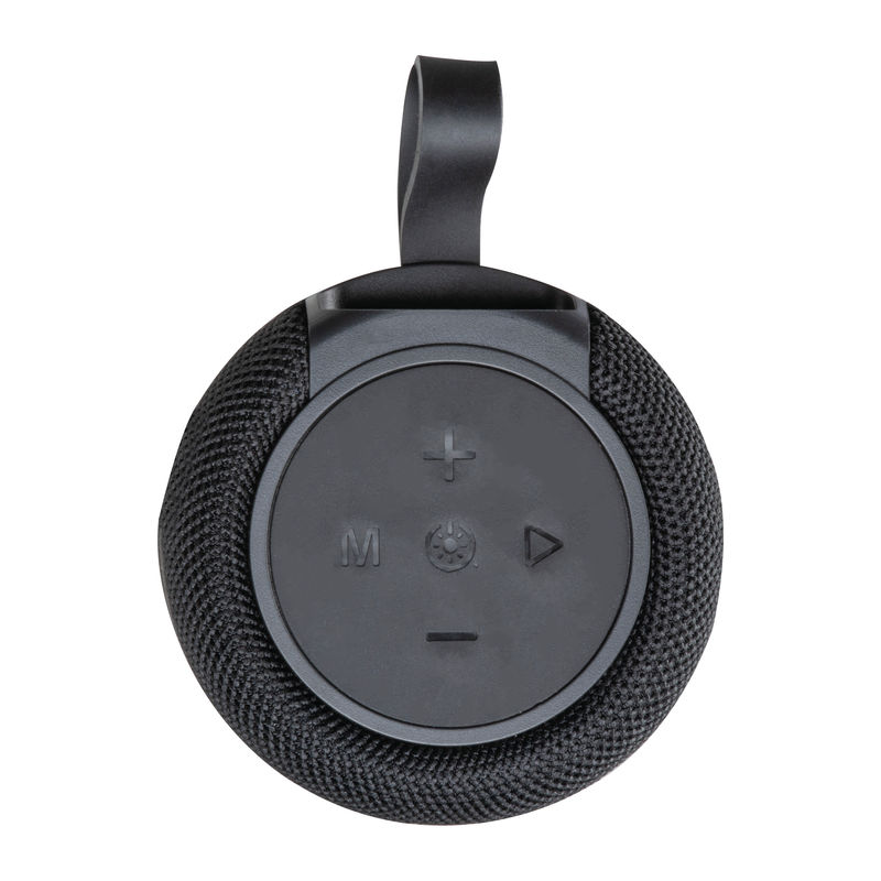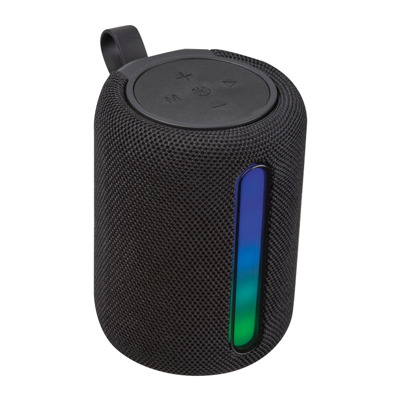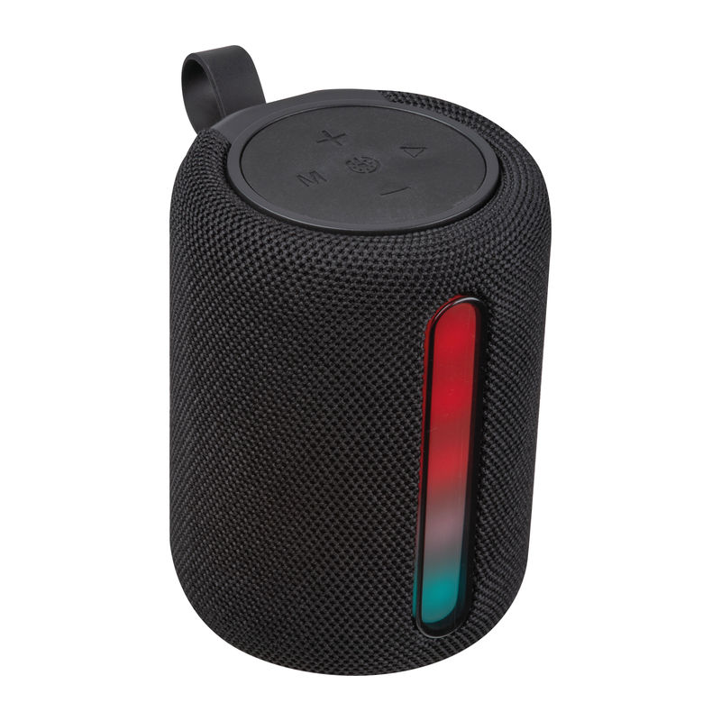 Bluetooth speaker (version 5.3) in round shape with 800mAh battery power (5V) with RGB LED light and charging cable. USB/Type-C connection, SD card slot and small carrying strap. We engrave your logo on the rubberised surface.