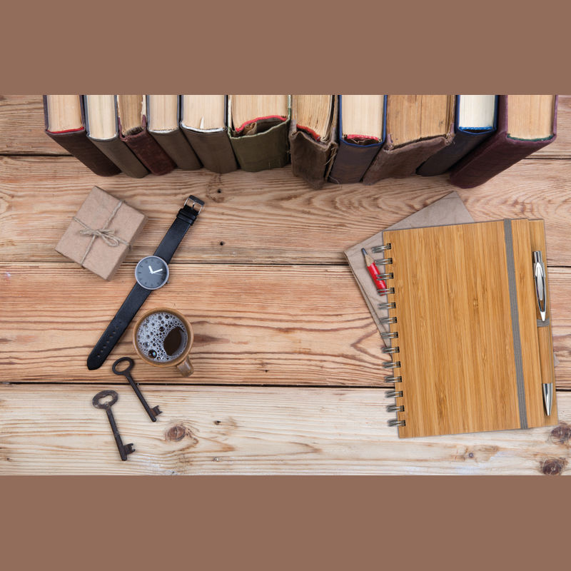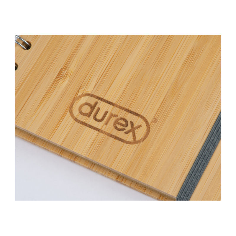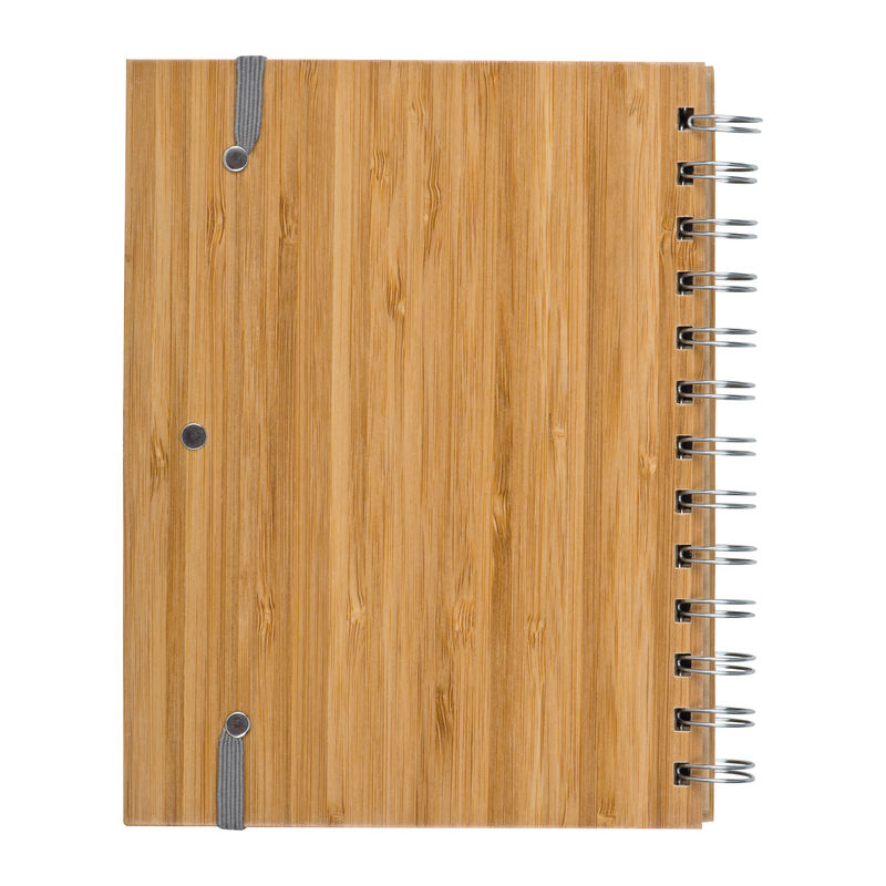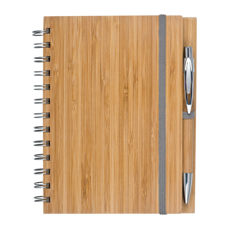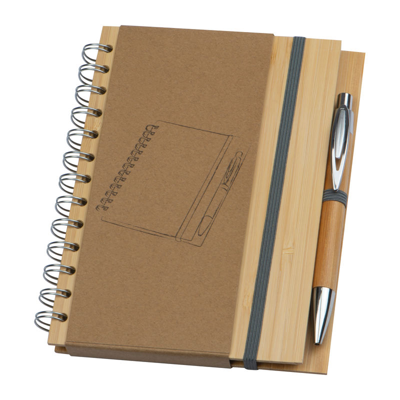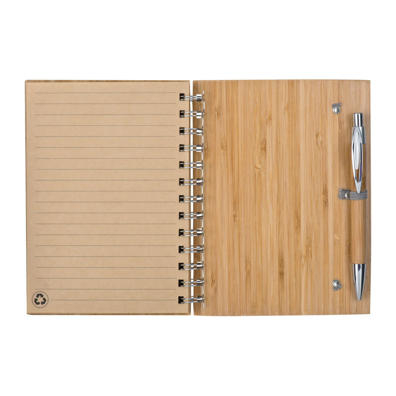 Modno in ekološko: beležnica v obliki plošče z ovitkom iz pravega bambusa in 140 vrsticami iz nebeljenega papirja za recikliranje, vključuje modro pisalno kroglično pero iz bambusa. Na ovitek bomo gravirali vaš logotip.