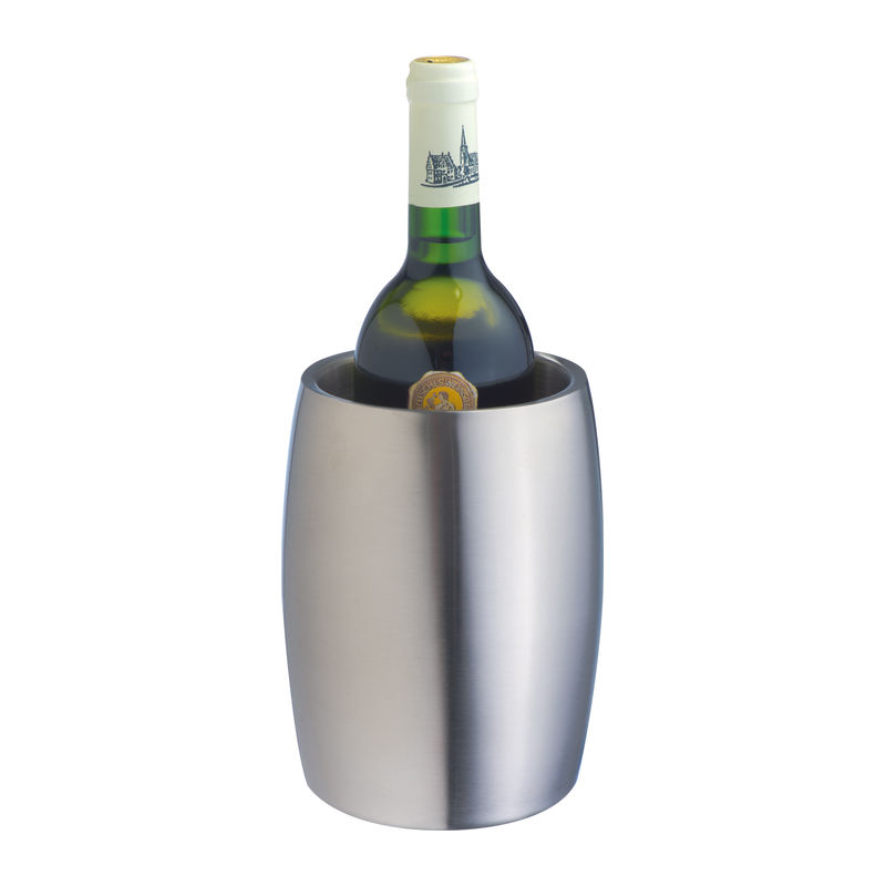 Hladilnik za vino iz visokokakovostnega dvostenskega nerjavečega jekla. Dolgo ohranja hladno brez kock ledu in je primeren za vse priljubljene velikosti steklenic. Vaš logotip bo graviran.