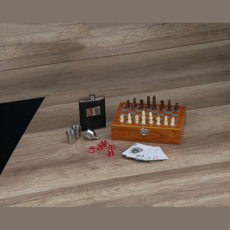 Igralni komplet s stekleničko za hip (prostornina 237 ml), 2 zaklepoma, 5 kockami, šahom in igro s kartami v leseni škatli. Vaš logotip bo graviran na stekleničko za hip.
