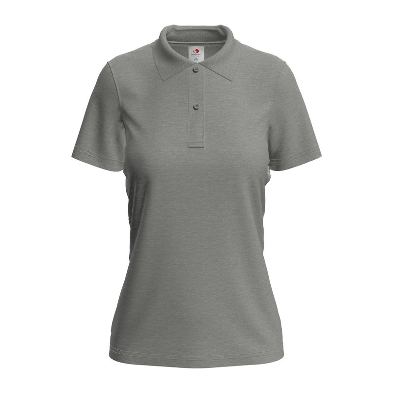 Mehka polo majica iz enojnega džersija za ženske s prijetnim pikčastim videzom, rebrastim ovratnikom in dvema gumboma v barvi.