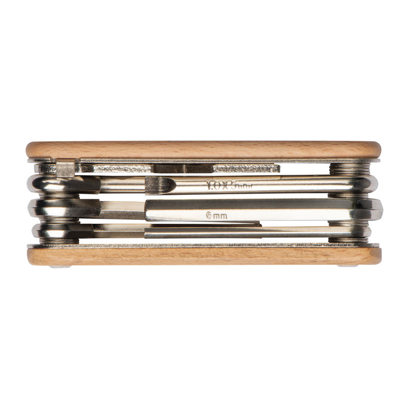 Kolesarsko orodje iz kovine in lesenega ohišja. Majhno in priročno orodje ne sme manjkati na naslednji kolesarski turi. Na leseno ohišje z laserjem vtisnemo vaš logotip.