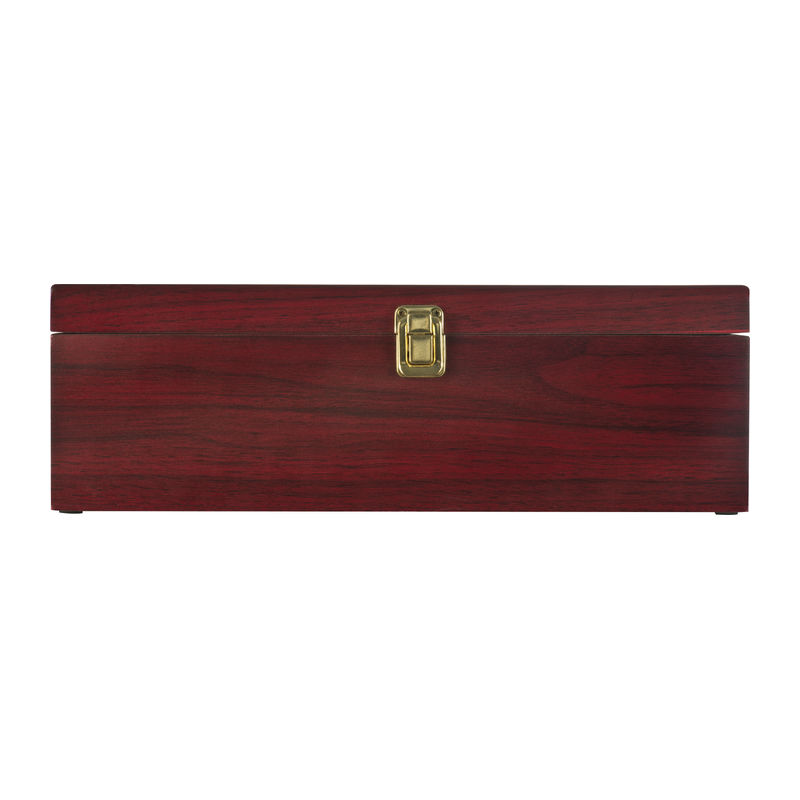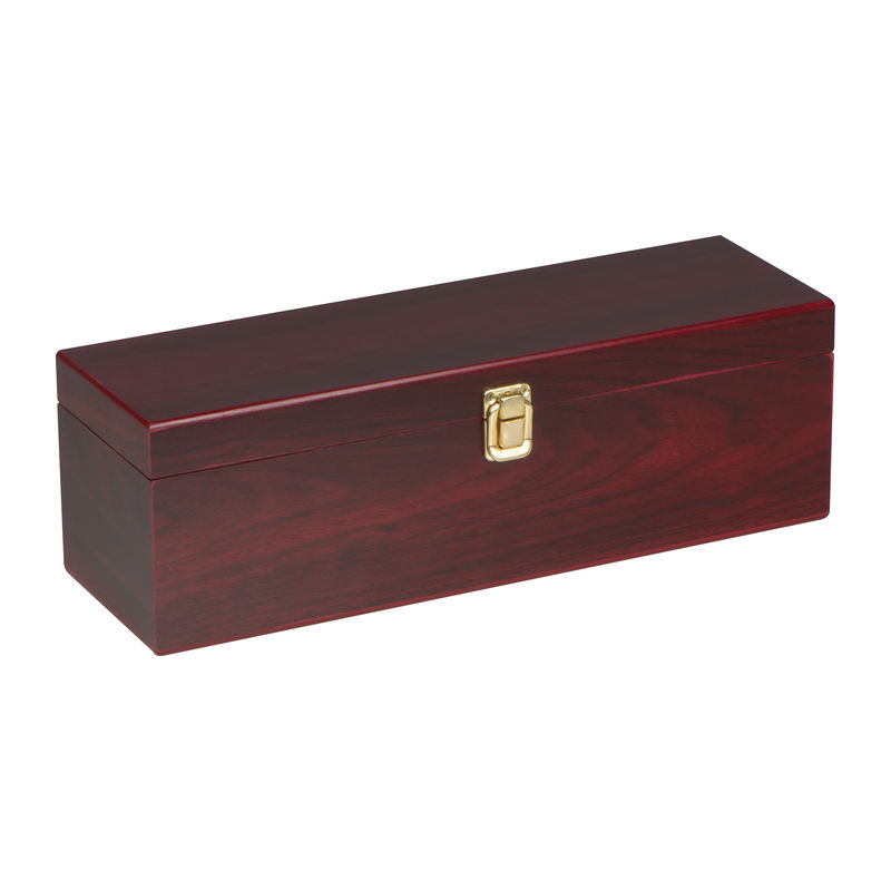 Lesena škatla za vino* z vgrajenim natakarskim nožem, pokrovčkom za steklenice, izlivom in obročem za spuščanje. Dodatna lesena pregradna stena zagotavlja večjo stabilnost steklenice vina. Na pokrov zabojčka bomo natisnili vaš logotip.