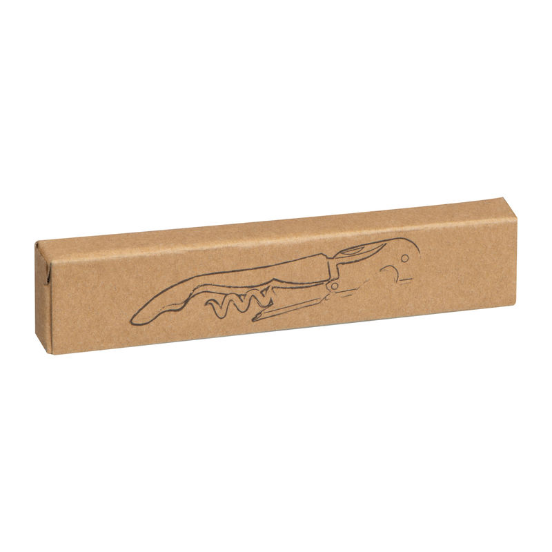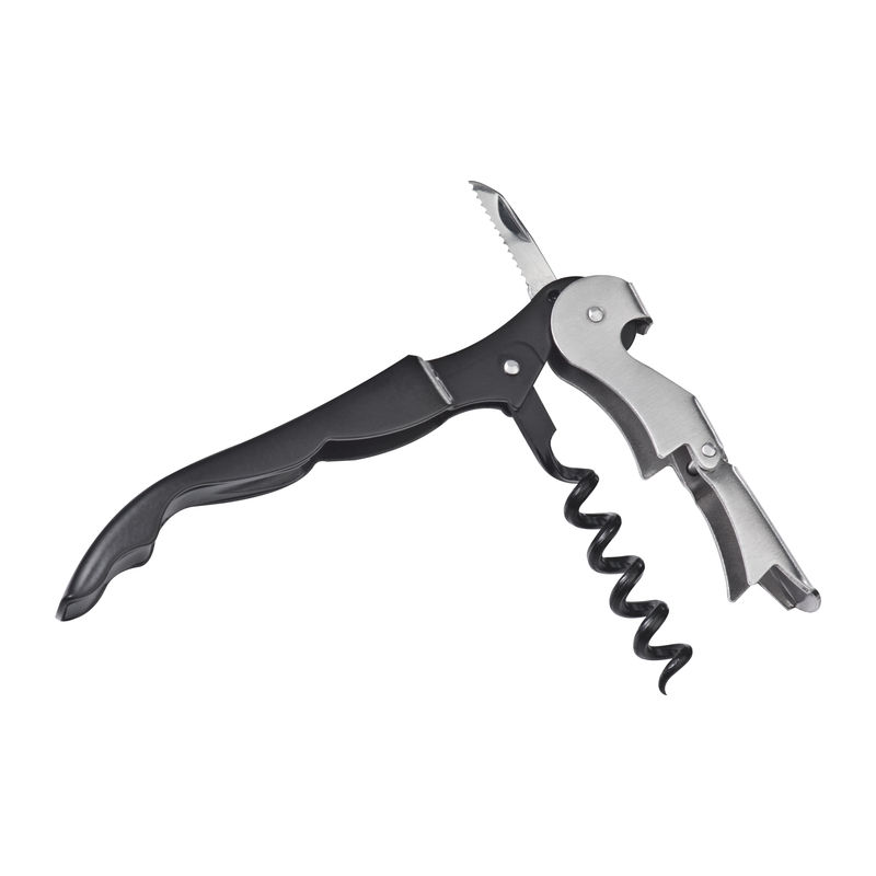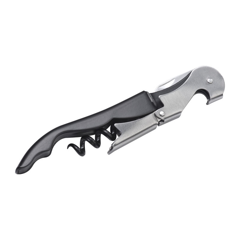 Kovinski natakarski nož z odpiračem za steklenice, rezalnikom folije in zamaškom z 2 stopnjama dviga. Na črno površino graviramo vaš logotip.