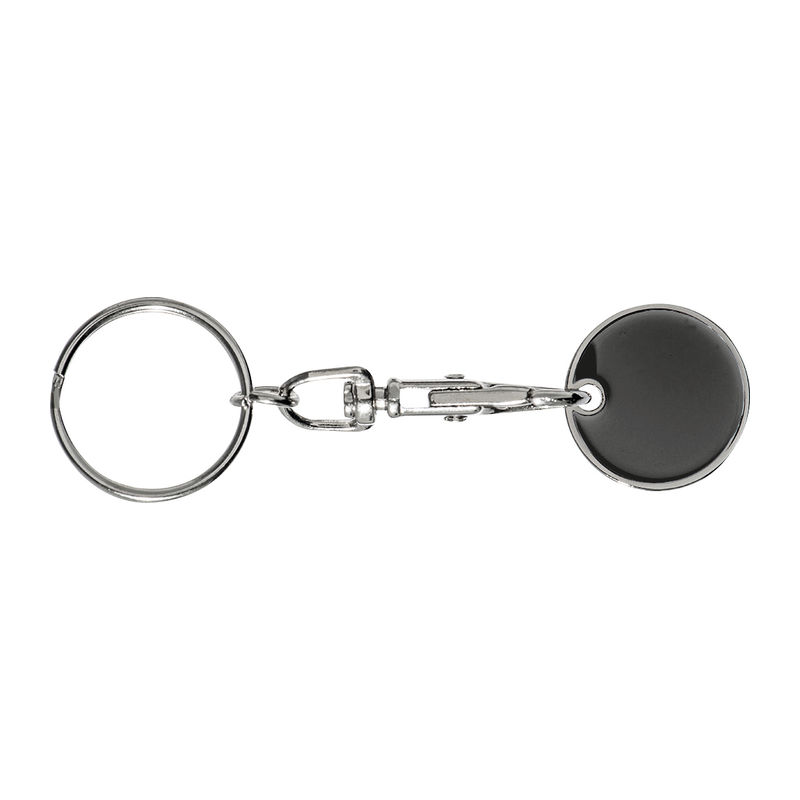 Kovinski obesek za ključe s kavljem in nakupovalnim kovancem. Na srebrno stran kovanca bomo gravirali vaš logotip.