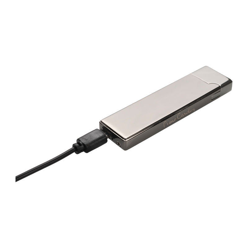 Električni vžigalnik Pierre Cardin za polnjenje v kovinski barvi. Vžigalnik ima gladko sijajno površino in elegantno obliko. Polni se s kablom USB, ki je priložen v paketu. Vžigalnik ima baterijo z zmogljivostjo 170 mAh in 1-2 uri polnjenja. Pakiran je v luksuzni škatli, priloženo je potrdilo o pristnosti.