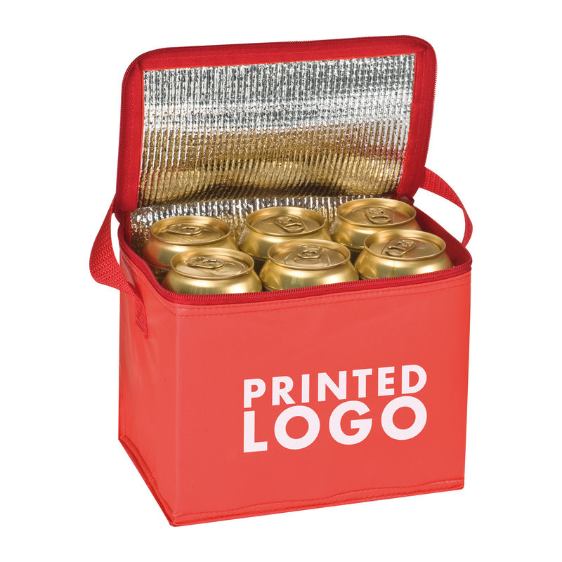 Hladilna torba iz poliestra z nosilnim trakom, primerna za 6 stoječih pločevink z vsebnostjo 0,5 l. Vaš logotip bomo natisnili na pokrov ali stranico.