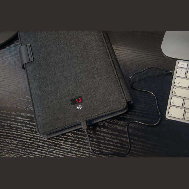 Powerbank mapa A5 z vgrajeno powerbank banko (4.000 mAh), beležnico (128 strani) in žepkom na sprednji strani. Vhod: 5V/1A - Izhod: 5V/2,1A. Na sprednji strani bomo natisnili vaš logotip.