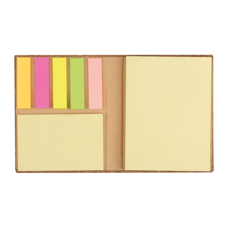 Zapisnik v platnicah iz plute s 5 samolepilnimi markerji različnih barv (po 25 kosov), rumenimi samolepilnimi lističi (25 kosov) in blokom z 200 stranmi. Vaš logotip bo natisnjen na ovitku.
