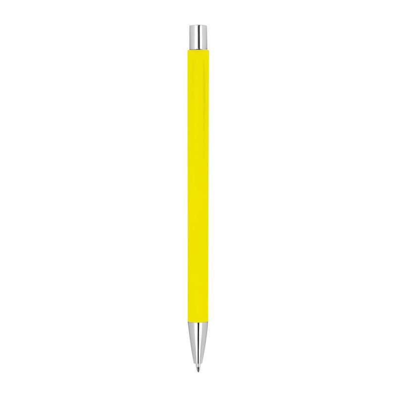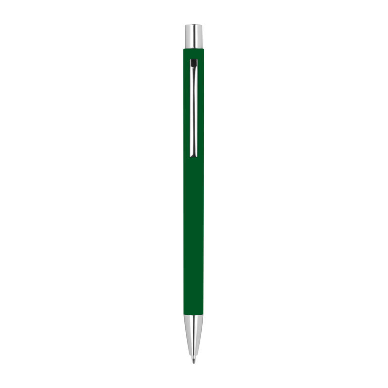 Tanko kovinsko zložljivo pisalo s srebrnimi aplikacijami in modro pisalno polnilo. Vaš logotip bo graviran na desni strani sponke.